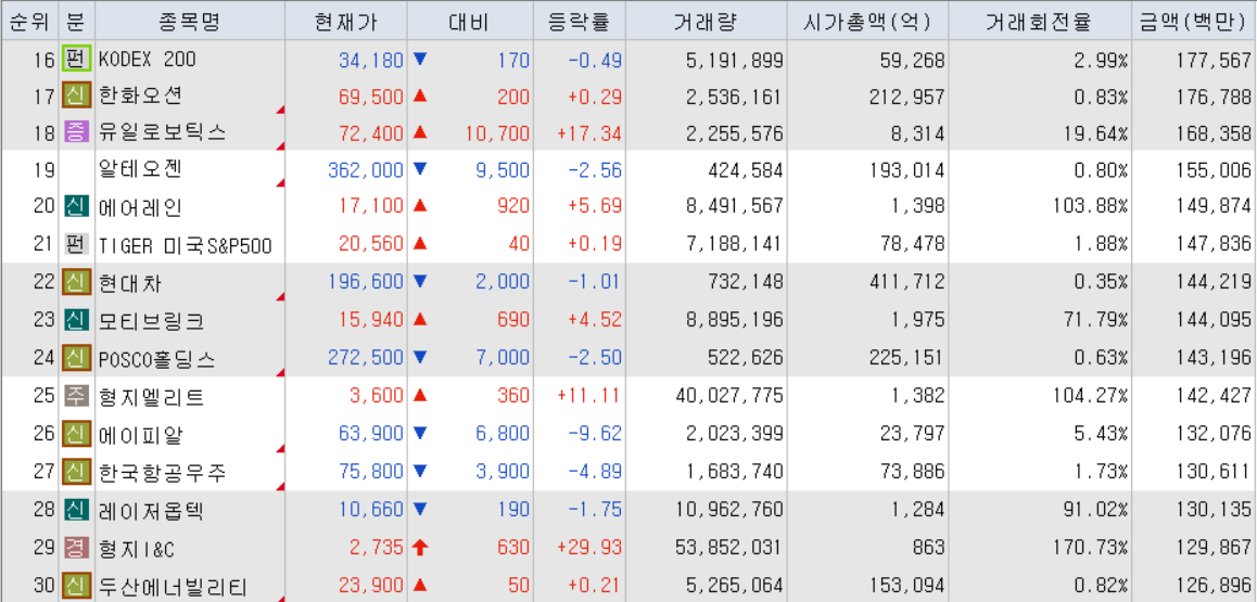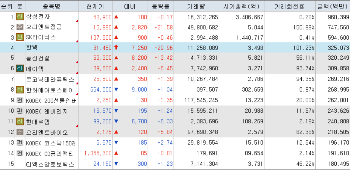 오늘의 거래대금 상위 종목