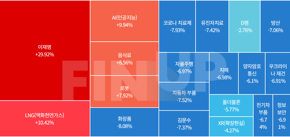 오늘의 특징주 섹터는 이재명 테마주, 음식료, 애경그룹, 틱톡관련주, 개별이슈 등