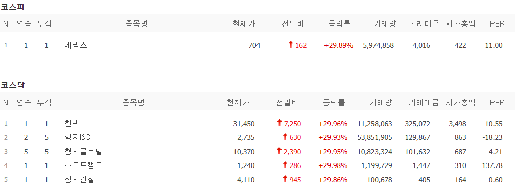 오늘의 상한가 종목