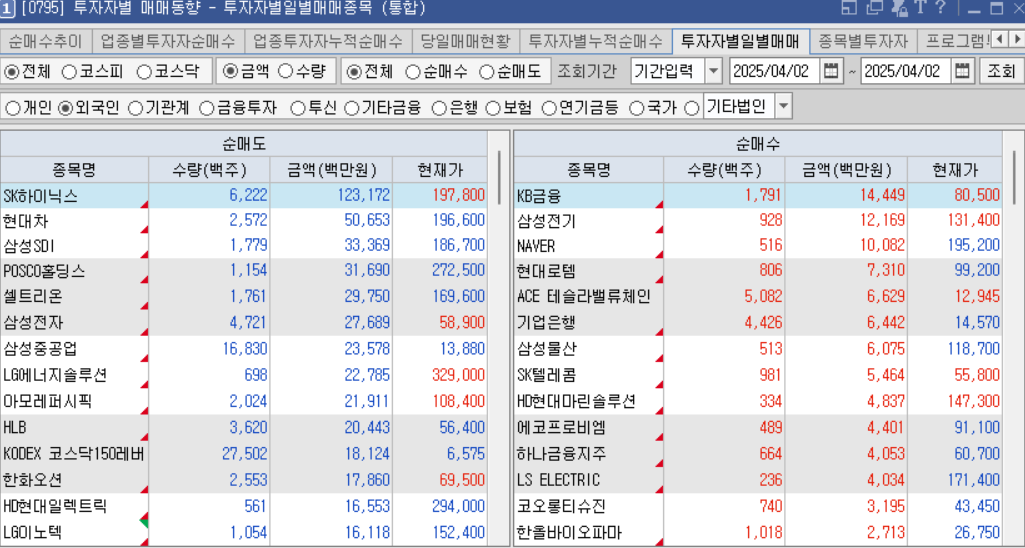 오늘 외국인 순매수 종목은 금융, 방산, 조선, 2차전지, 제약바이오 순매수를 했음.
