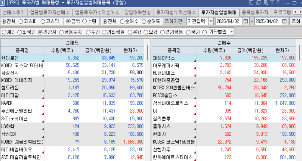 오늘 기관 순매수 종목은 반도체, 화장품, 조선, 제약바이오, 자동차, 금융등을 순매수함.