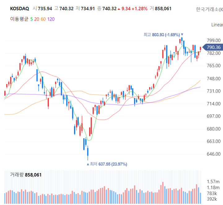 오늘 코스닥 지수도 외국인 순매수에 상승 마감. 코스닥 지수는 0.78% 상승한 790.36으로 마감.