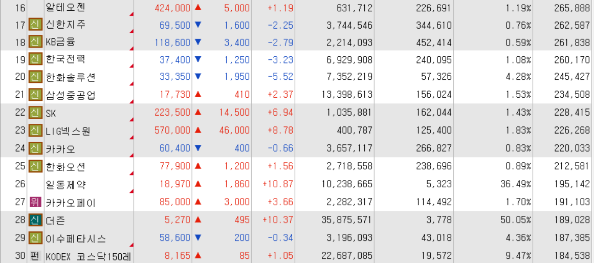 거래대금은 12조 4568억 원으로 전날보다 1조원 가량 줄어듦.