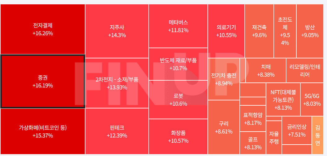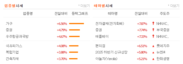 업종별로 조선, 방산 업종이 상승을 했고 상법개정 이슈와 함께 지주사, 증권주가 오늘도 크게 상승함.