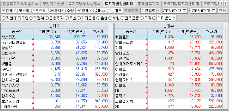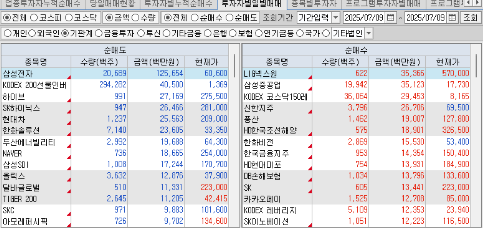 전체적으로 상법개정 지주사, 주도섹터인 방산, 조선을 순매수, 반도체, 화장품은 차익실현 순매도.