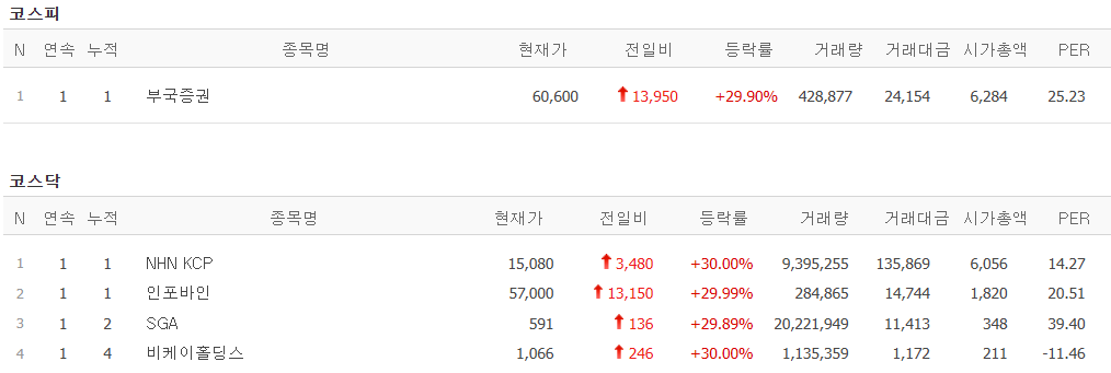 상법개정이슈로 인해서 부국증권,인포바인 종목이 상한가 마감을 했고 스테이블 코인 관련해서 NHN KCP 종목이 상한가 마감함.