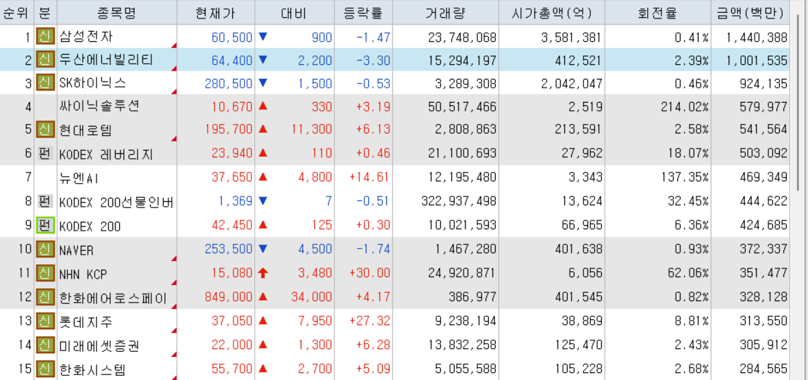 오늘 거래대금 상위 종목에서는 신규상장주인 싸이닉솔루션이 장초반 크게 상승 후 상승분 반납했고, 방산주, 지주사, 증권주가