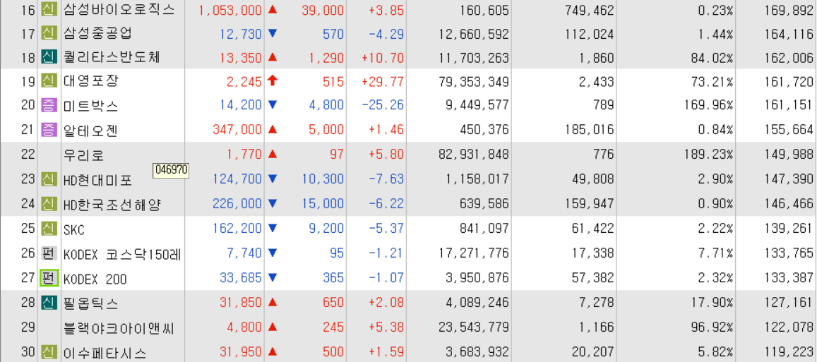 오늘 거래대금 상위 종목에서는 티웨이 항공발 경영권 이슈로 상승,  반도체, 전력, 자동차 등 상승