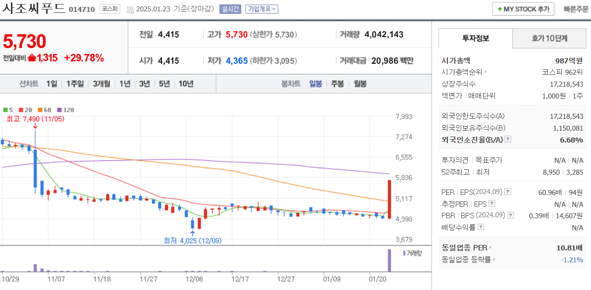 참치 가공 및 원양업체 사업을 하고 있음. 오늘 상한가 이유로는 수산 테마주 플러스 김문수 테마로