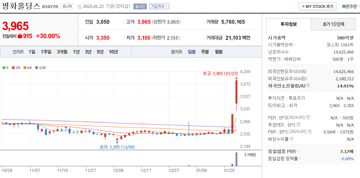어제에 이어서 2 연속 상한가 마감을 했음. 오늘 52주 신고가를 경신했고 테마가 형성되어 좋음.