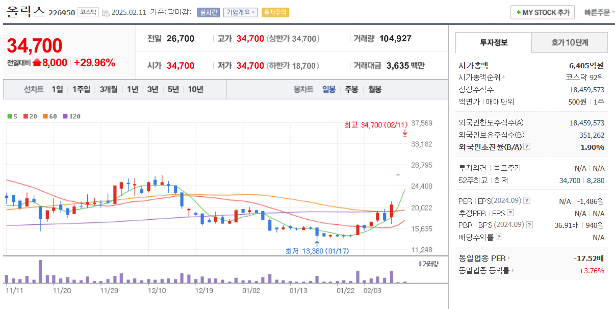 생산 및 판매하는 사업을 함. 오늘은 어제에 이어서 연속 상한가 마감을 함.
