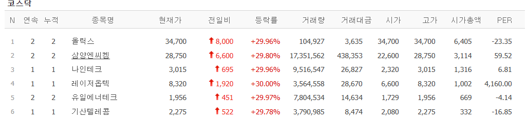 (올릭스, 삼양엔씨켐, 유일에너테크) 연속 2 상한가.