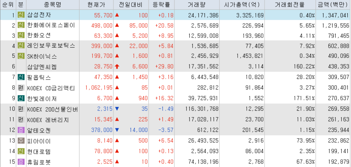 오늘 거래대금 상위 종목에서는 한화 그룹주가 크게 상승, 유리기판주, 로봇 관련주, 인터넷 주 등 상승함.