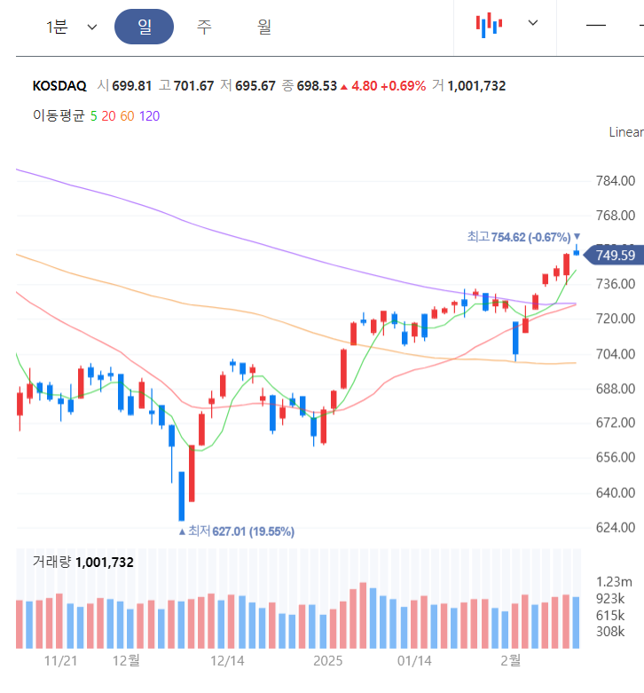 코스닥 지수는 0.01% 하락한 749.59로 마감. 외국인과 기관이 각각 179억원, 311억 원 순매도.