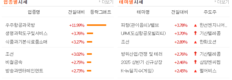 시가 총액 상위종목에서는 반도체 상승, 한화에어로스페이스가 실적과 한화오션 지분 취득 이슈로