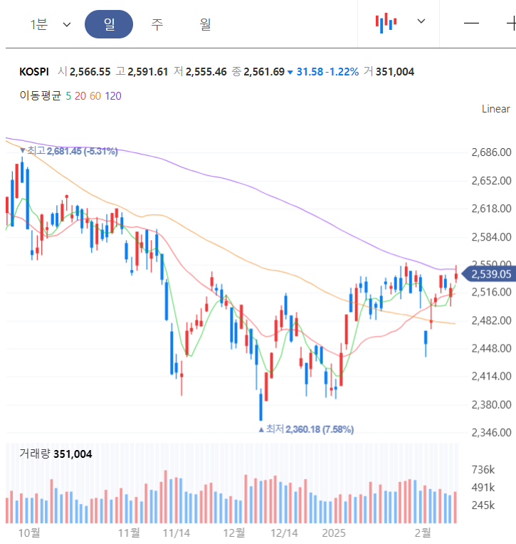 코스피 지수는 0.71% 상승한 2539.05로 마감. 외국인과 기관이 각각 1410억 원, 2438억 원 순매수.