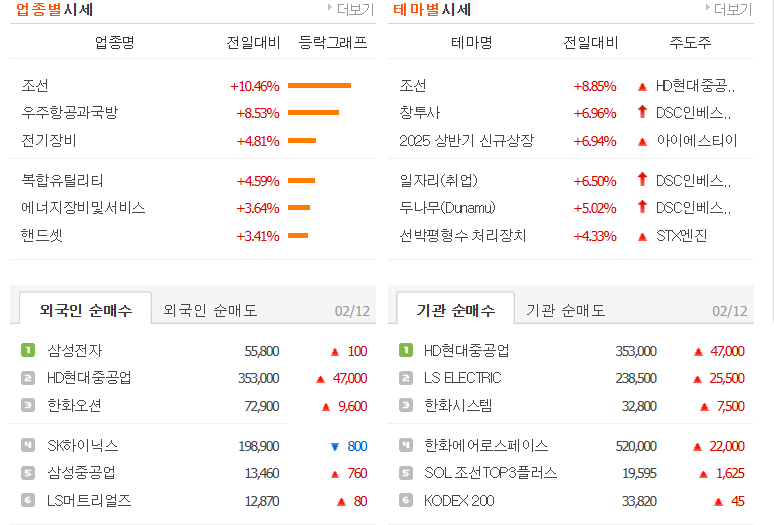 크게 움직임을 보였음. 외국인 기관 순매수상위 종목에서도 HD현대중공업 한화그룹관련주 순매수