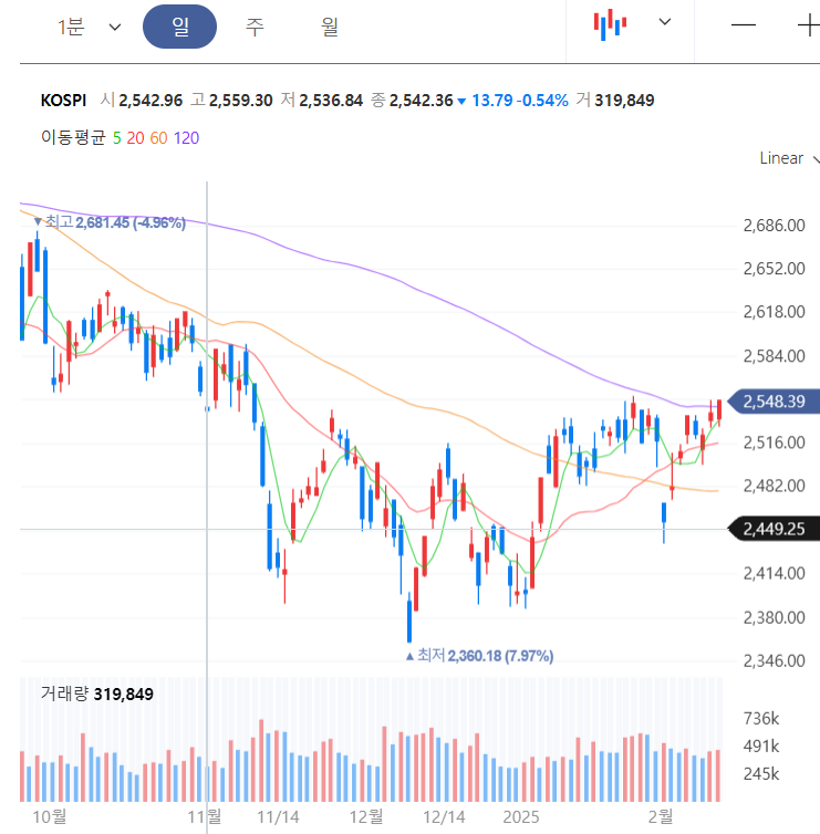 코스피 지수는 0.37% 상승한 2548.39로 마감. 일봉상 5일선 깨지 않고 재상승 120선 위로 마감.
