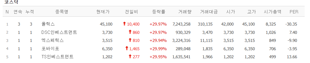 오늘의 상한가는 5종목 으로 새로운 섹터에서 상한가 마감.