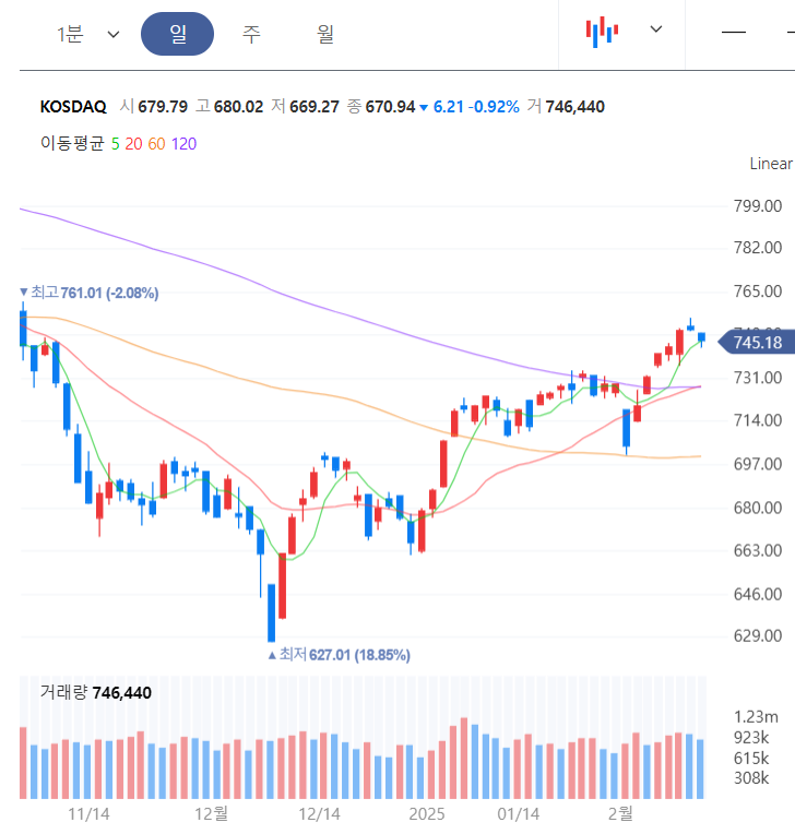 코스닥 지수는 0.59% 하락한 745.18로 장을 마감. 외국인과 기관이 각각 1210억원, 557억 원 순매도.