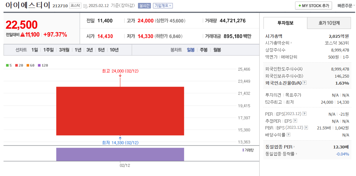 오늘 시초 상한가 출발해서 갭 상한가 마감을 함. 평소 거래량보다는 많았지만 적은 거래량으로 상한가.