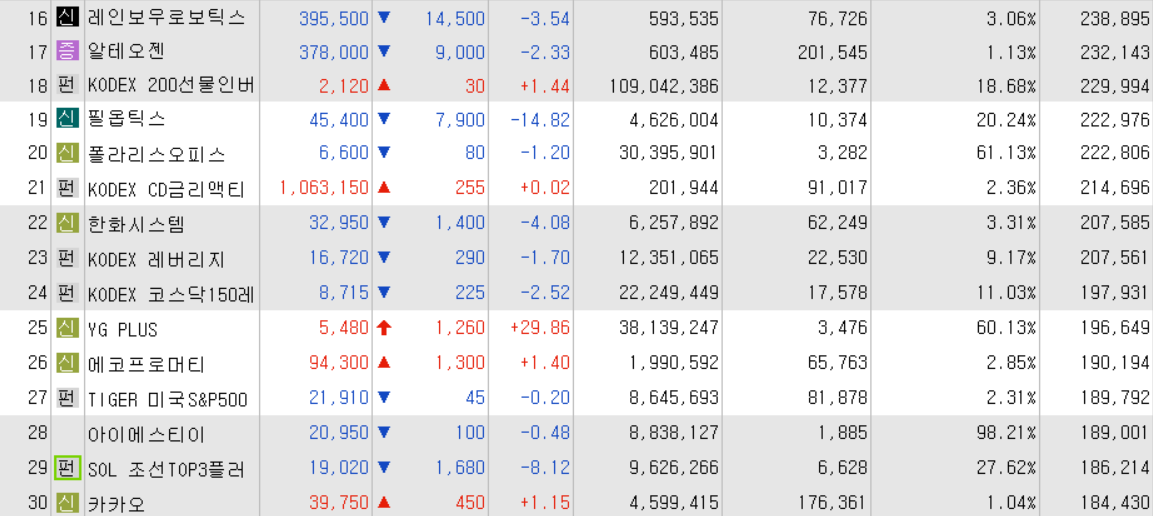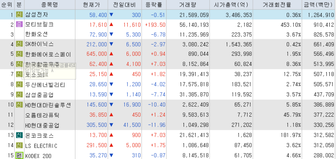 오늘의 거래대금 상위 종목