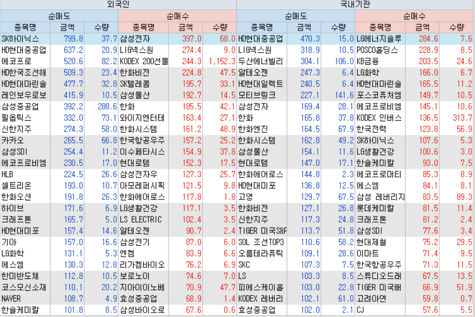 오늘 외국인 순매수 상위 종목에서는 반도체, 엔터, 지주회사, 화장품, 제약바이오 등 순매수했음.