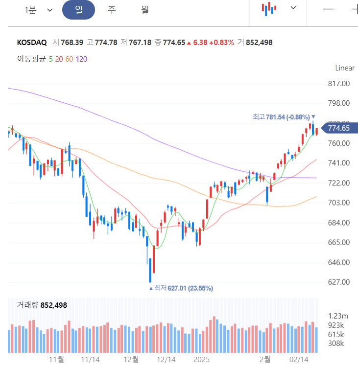 코스닥 지수는 0.83% 상승한 774.65로 마감. 외국인이 1144억 원 순매수, 기관이 79억 원 순매도.