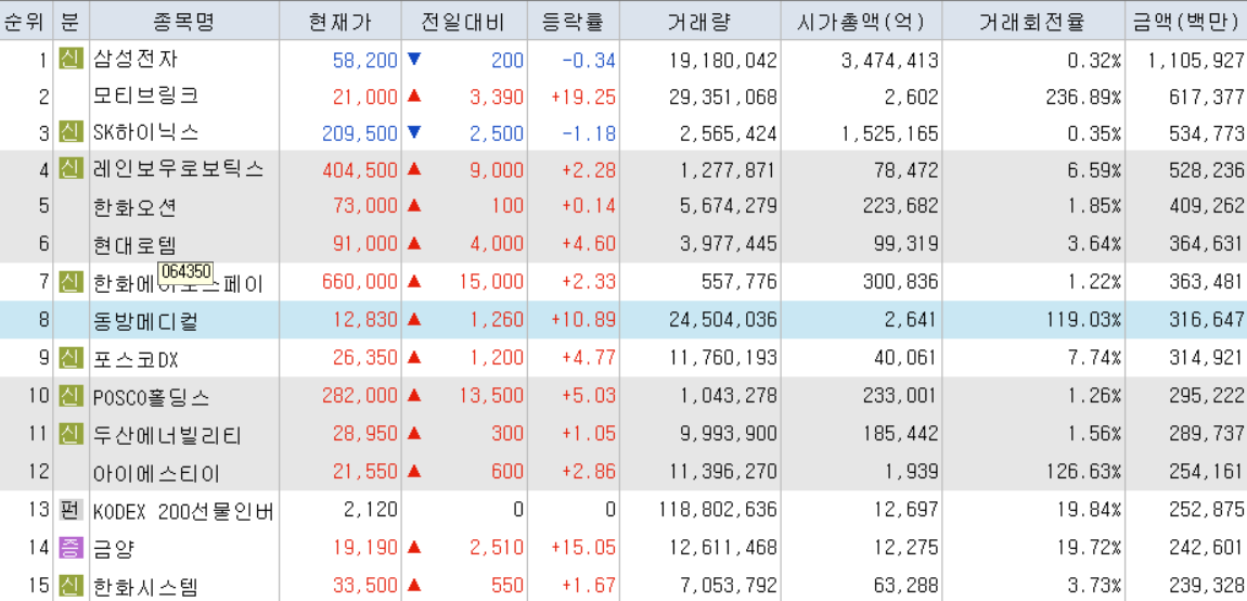 오늘 거래대금 상위 종목에서 신규상장주인 모티브링크 종목이 오늘 상한가 찍고 흘러내렸지만 크게 상승.