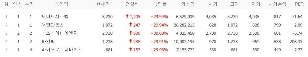 오늘의 상한가 종목