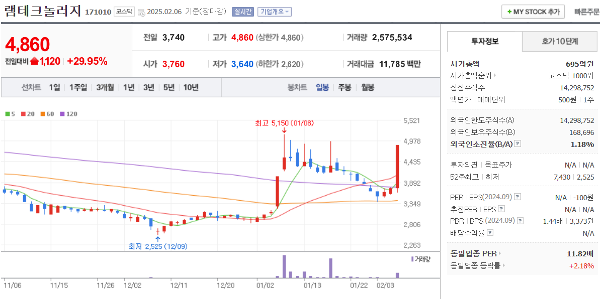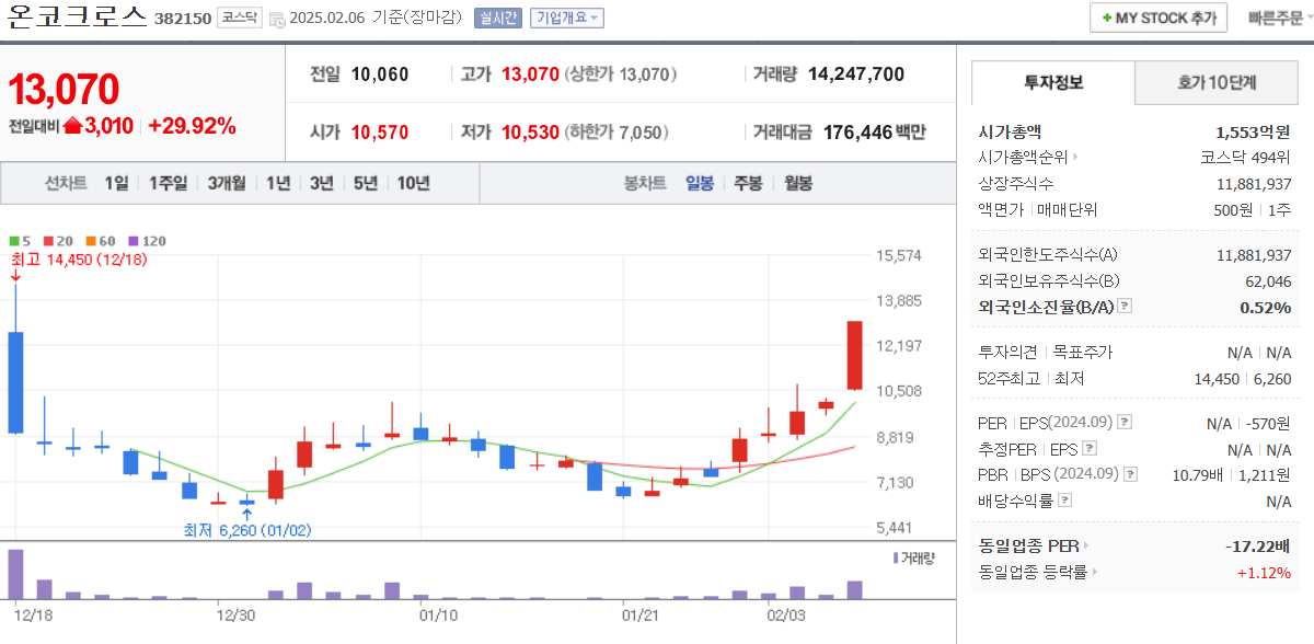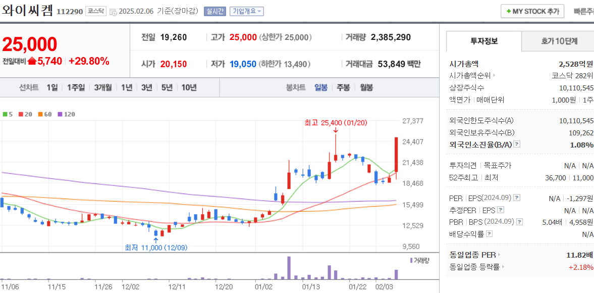 관련주 부각 상한가 마감함. 이종목은 신규상장주로 오늘이 종가상 최고점을 기록함.