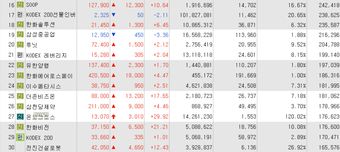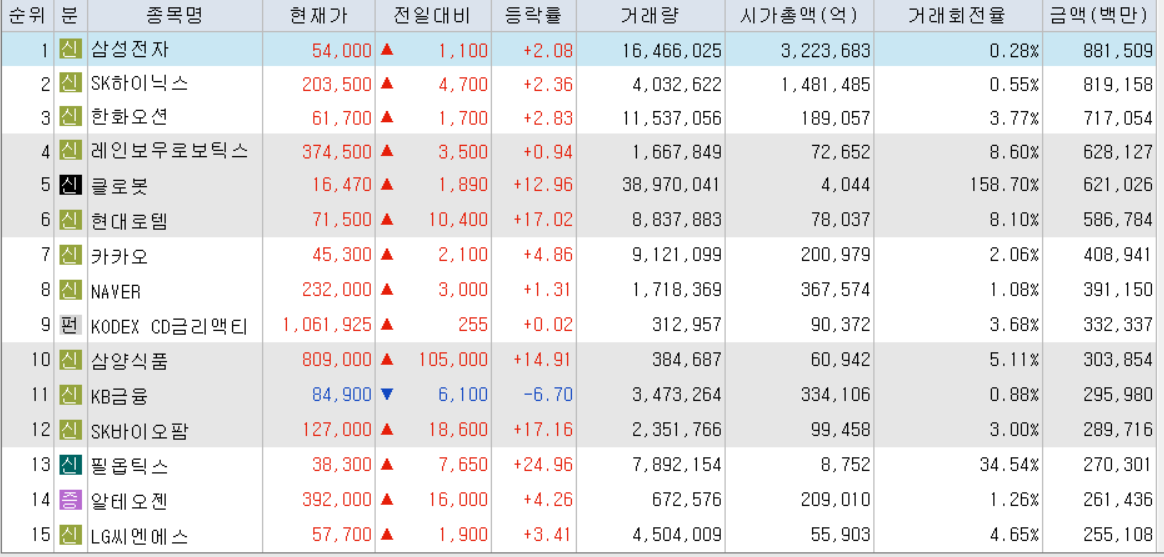 오늘 거래대금 상위 종목에서는 반도체, 로봇 섹터에서 상승을 이어갔고 AI 신약 이슈로 인해서