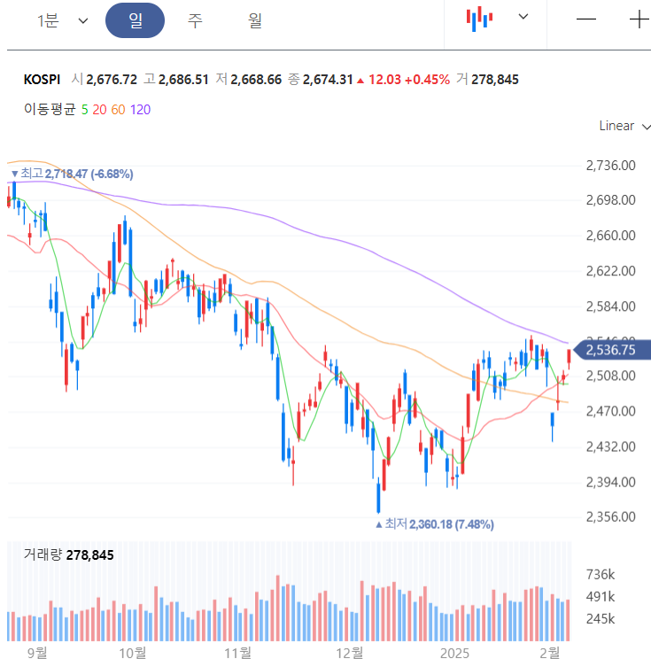 코스피 지수는 1.10% 상승한 2536.75로 마감하며 지난 고점 까지 회복했음.
