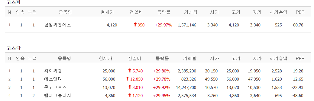 관련주들이 상승마감. 이종목은 시총이 적고 적은 거래대금으로 상한가 마감.