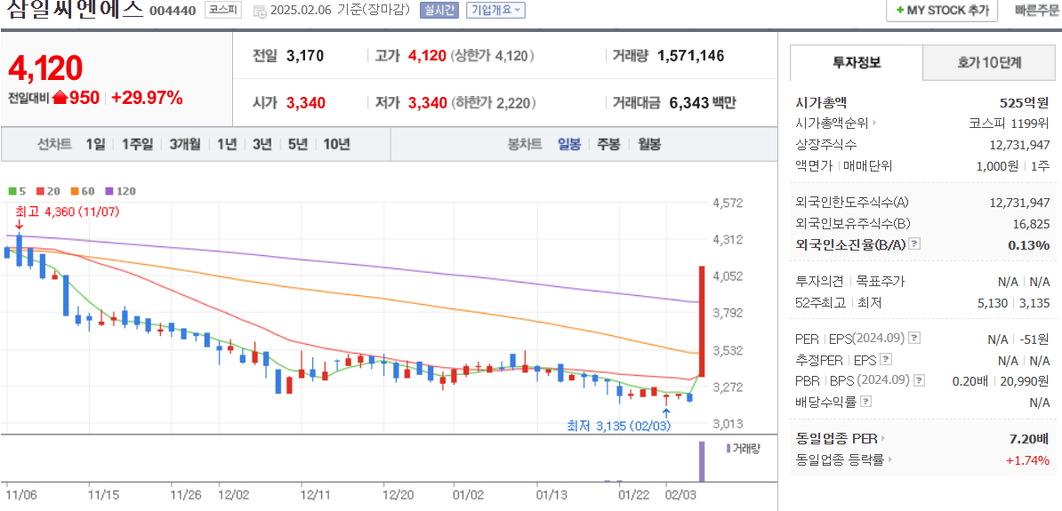 차트상으로 바닥권에서 횡보 후 상한가 마감하면서 120일 선 위로 마감.