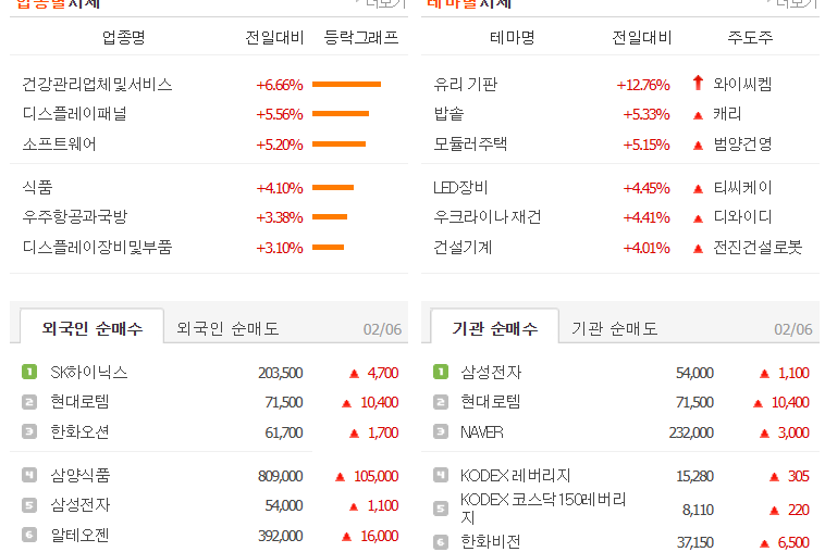 오늘의 주식 시장 정리(2월 6일 목요일 상한가 종목 및 특징주)