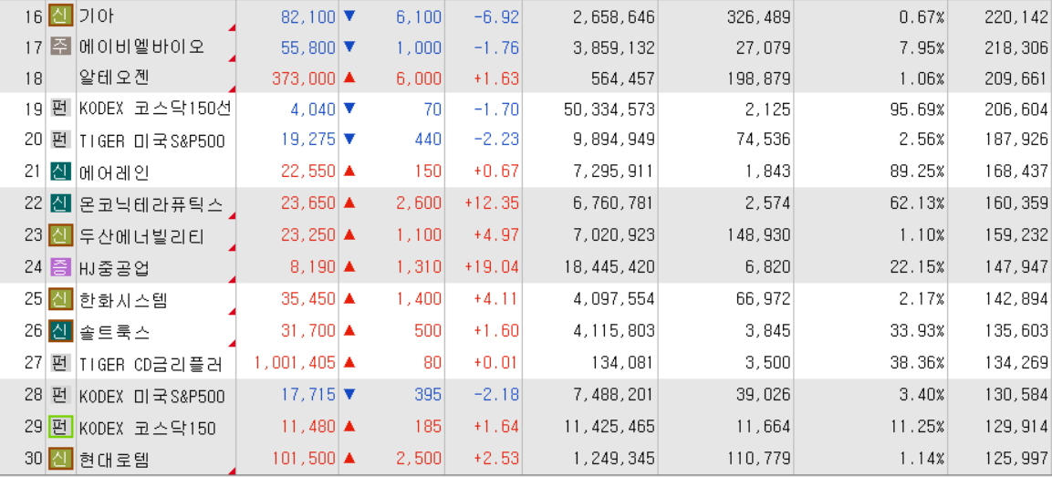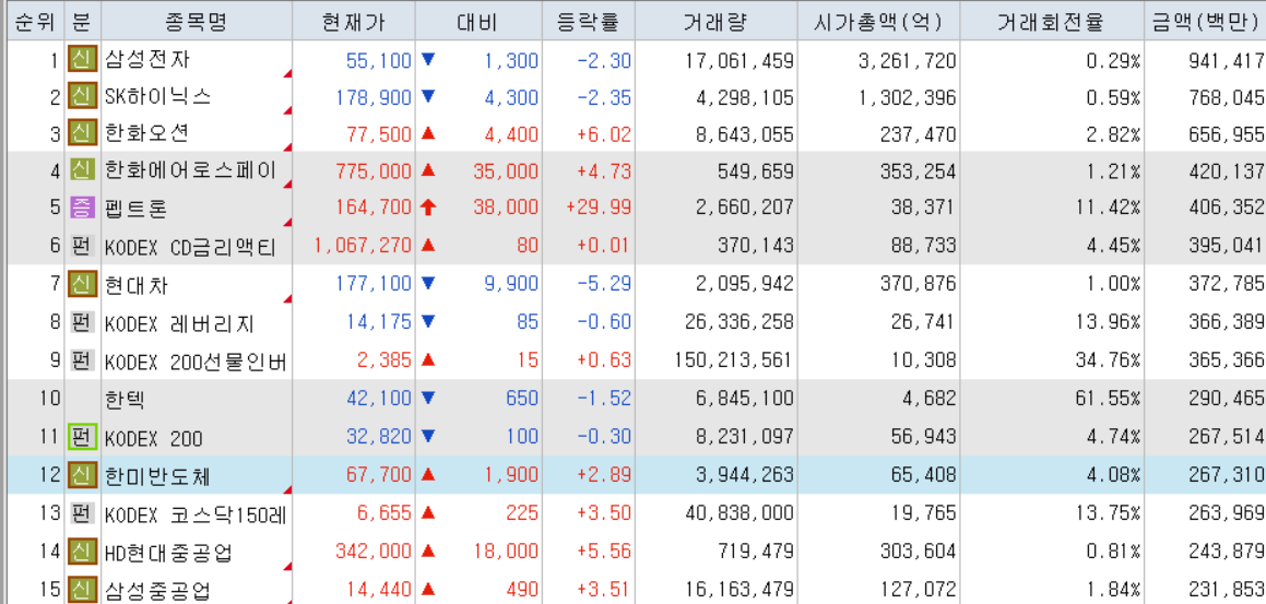 오늘 거래대금 상위 종목에서 반도체, 자동차 섹터가 크게 하락을 보였고 제약바이오, 방산, 조선 섹터에서 큰 상승을