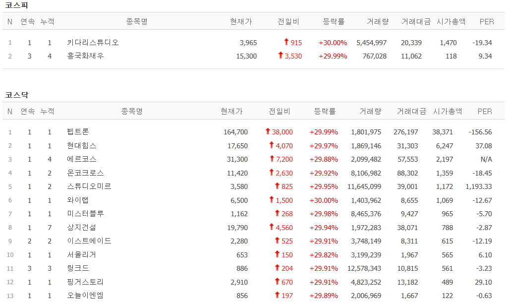 오늘 상한가 종목은 15종목으로 시총이 낮은 종목 동전주는 제외함.