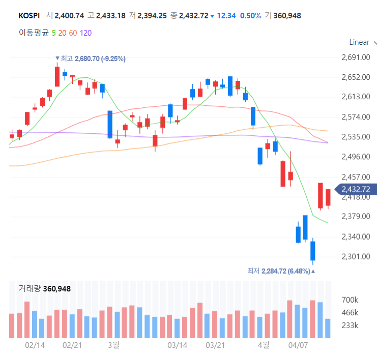 오늘 코스피 지수는 미 관세 이슈로 미장이 다시 폭락을 한 영향으로 코스피 역시 크게 하락출발했지만