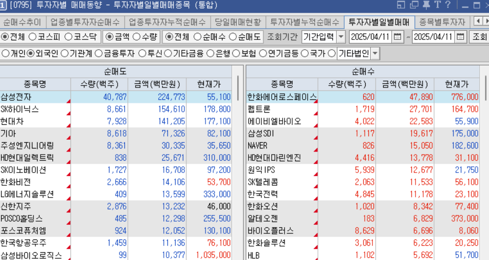 오늘 외국인 순매수 상위 종목에서는 방산, 제약바이오, 조선, 전력, 인터넷, 등을 순매수했고