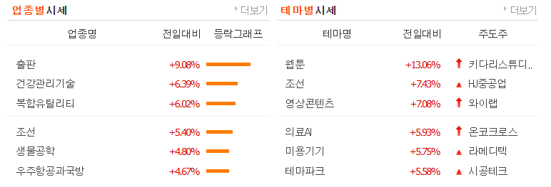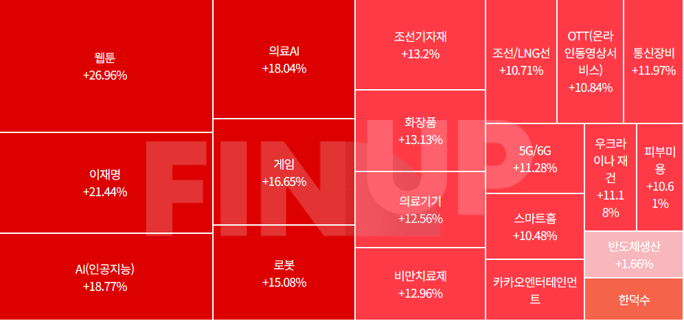 오늘 웹툰관련 정책이슈가 나오면서 관련주들이 크게 상승을 보였고 AI 관련주, 의료 AI, 영상콘텐츠 등이 상승함.