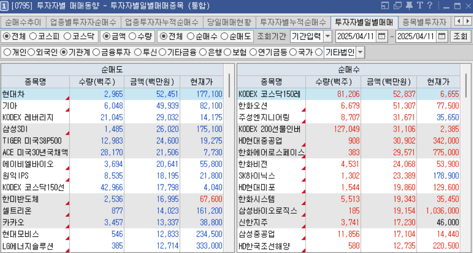 오늘 기관 순매수 종목에서는 조선, 방산, 반도체, 제약바이오 등을 순매수했고