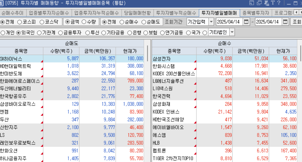 오늘 외국인 순매수 종목은 반도체, 방산, 전력, 조선, 제약바이오, 엔터, 2차 전지를 순매수