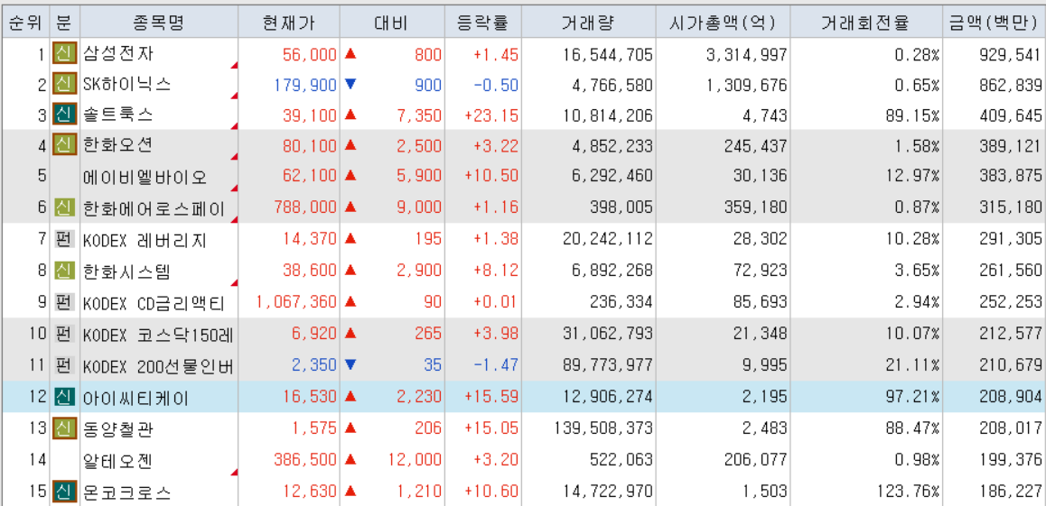 오늘 거래대금 상위 종목에서는 AI 챗봇 관련주인 솔트룩스가 크게 상승하면서 거래대금 상위에 올랐음.