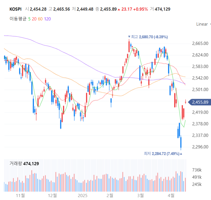 코스피는 0.95% 상승한 2455.89로 마감. 외국인과 기관이 각각 2558억 원, 92억 원 순매도.