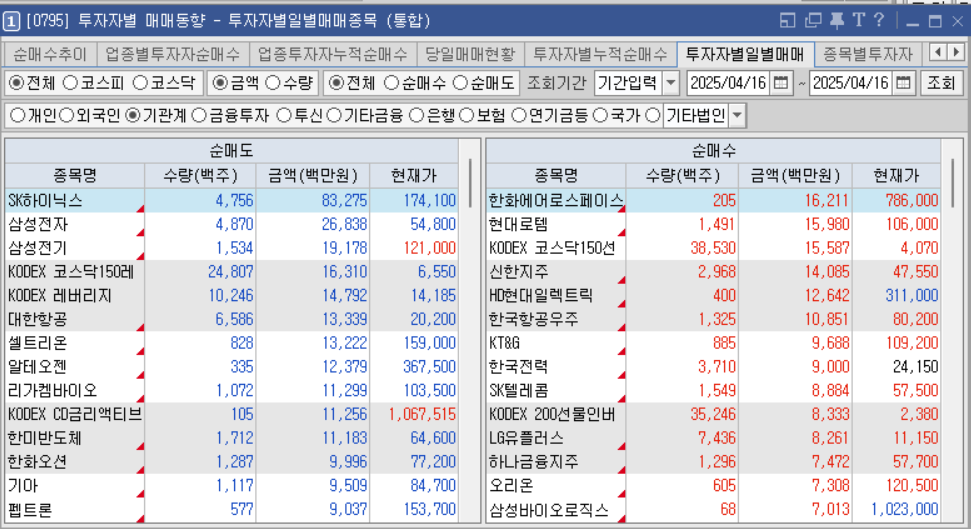 오늘 기관 순매수 상위 종목에서는 방산, 전력, 식품, 경기방어주를 순매수함.