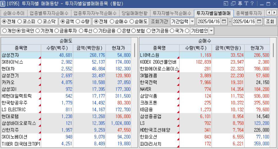 순매도 종목은 반도체, 항공, 제약바이오, 조선, 자동차등을 순매도함.