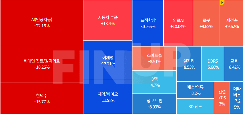 퓨리오사 AI 관련주가 오늘도 상승을 이어갔고 비대면 원격진료, 로봇, 제약바이오 등이 상승을 보였음.
