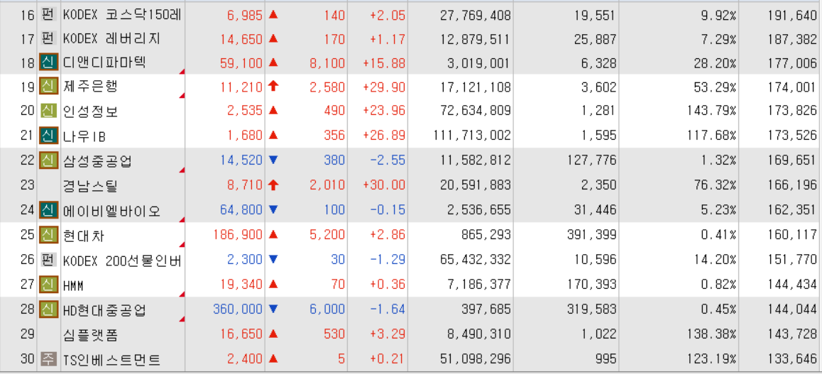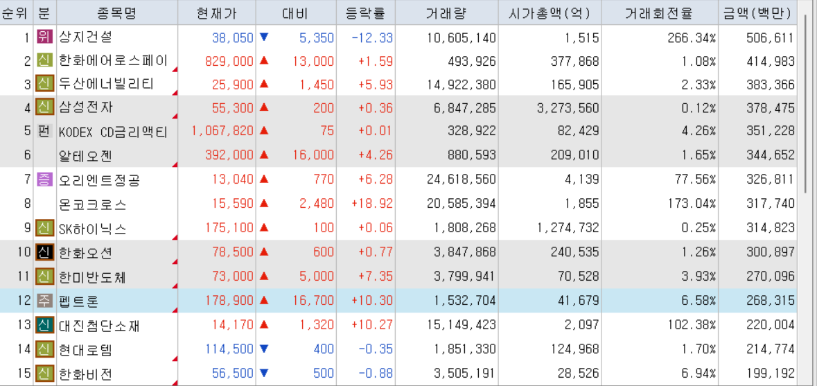 넘게 하락하면서 상위에 올랐음. 거래대금이 많이 줄어든게 1위가 5천억 거래대금임.