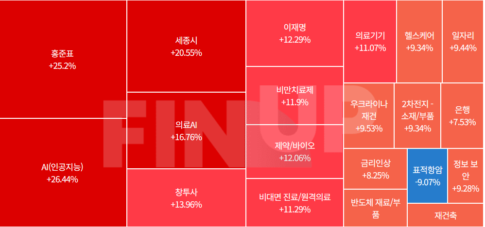 오늘의 특징주 섹터는 퓨리오사 AI, 홍준표 테마주, 세종시테마주, 의료AI, 개별 이슈 등